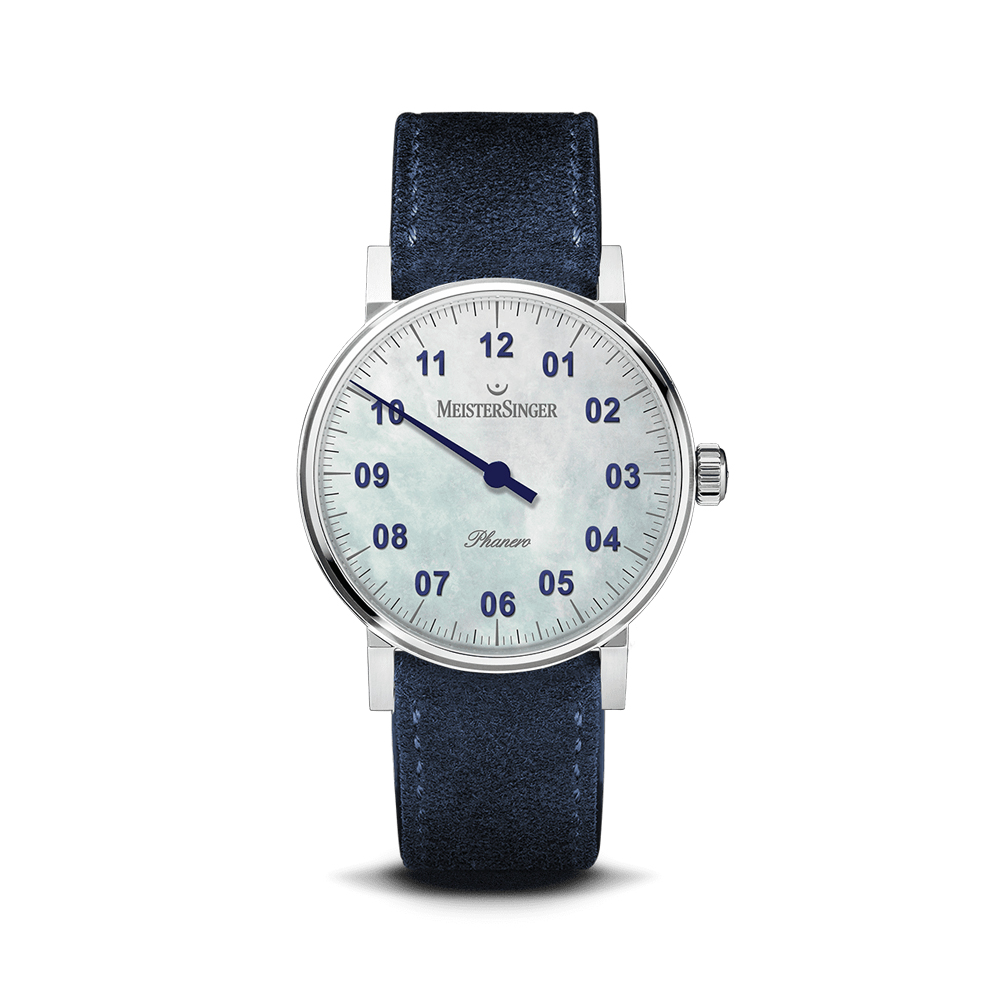 Die Perigraph zählt längst zu den Klassikern von MeisterSinger. Der Datumsring ist komplett freigelegt, strukturiert das Zifferblatt und verleiht ihm Tiefe. In aller Ruhe dreht der zentrale Nadelzeiger seine Kreise. Ein kleiner blauer Pfeil bei 12 Uhr verweist auf das aktuelle Datum. In dieser Ausführung trägt er ein glänzend weißes Zifferblatt mit goldenen Stundenzahlen und blauen und schwarzen Kontrasten der Indizes.