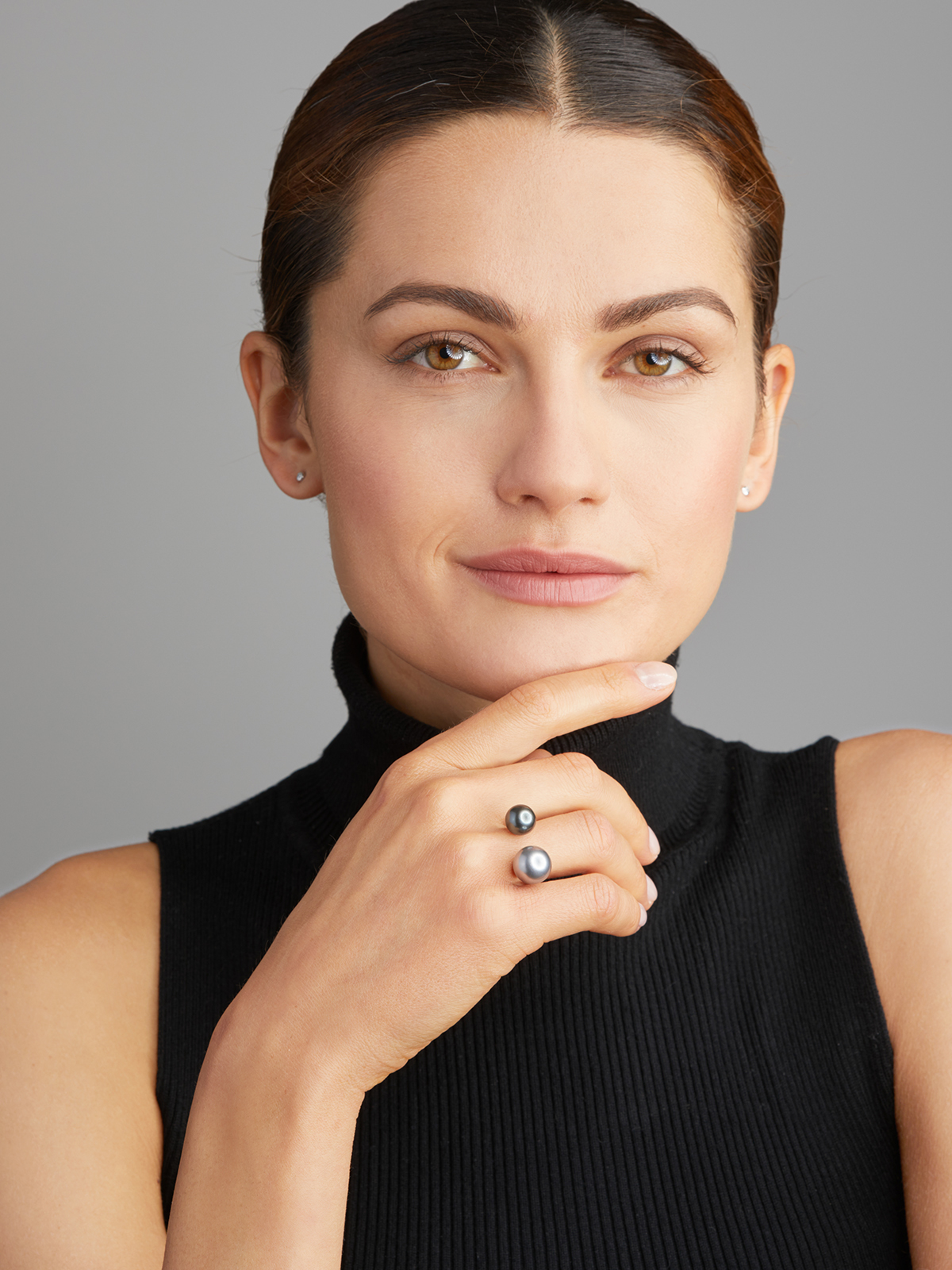 Yana Nesper Offener Weißgoldring mit schwarzer und grauer Perle Open Mind